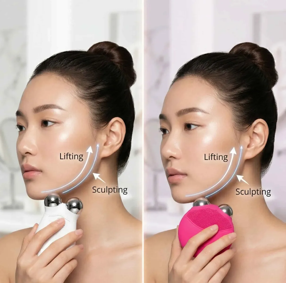 - The NuFace features wider metal spheres. These spheres glide smoothly but manage to grip the contours of your jawline a bit deeper. It provides a very targeted, intense lift for that specific lower face area. If you are chasing those dramatic Nuface jowls before and after results, this deep grip is exactly what you need.
