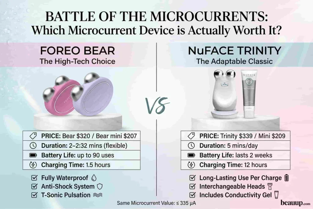Hitting your 30s and seeing those first wrinkles and sagging skin is incredibly stressful for both women and men. Skincare clinics offer amazing treatments, but let’s look at the facts: they cost a massive fortune, and booking monthly appointments drains time you simply do not have. You need a daily, affordable at-home solution to actually maintain that muscle tone long-term. That is exactly why investing in a microcurrent device (a tiny electrical facial workout) is a total game-changer, but choosing between NuFace and Bear is tough. Today, we are settling the NuFace vs Foreo Bear debate with a brutal, detailed comparison. Whether you are eyeing the classic NuFace Trinity+ Facial Toning device, the high-tech Foreo Bear, or the travel-sized Foreo Bear mini, I am breaking down exactly which tool deserves your money.